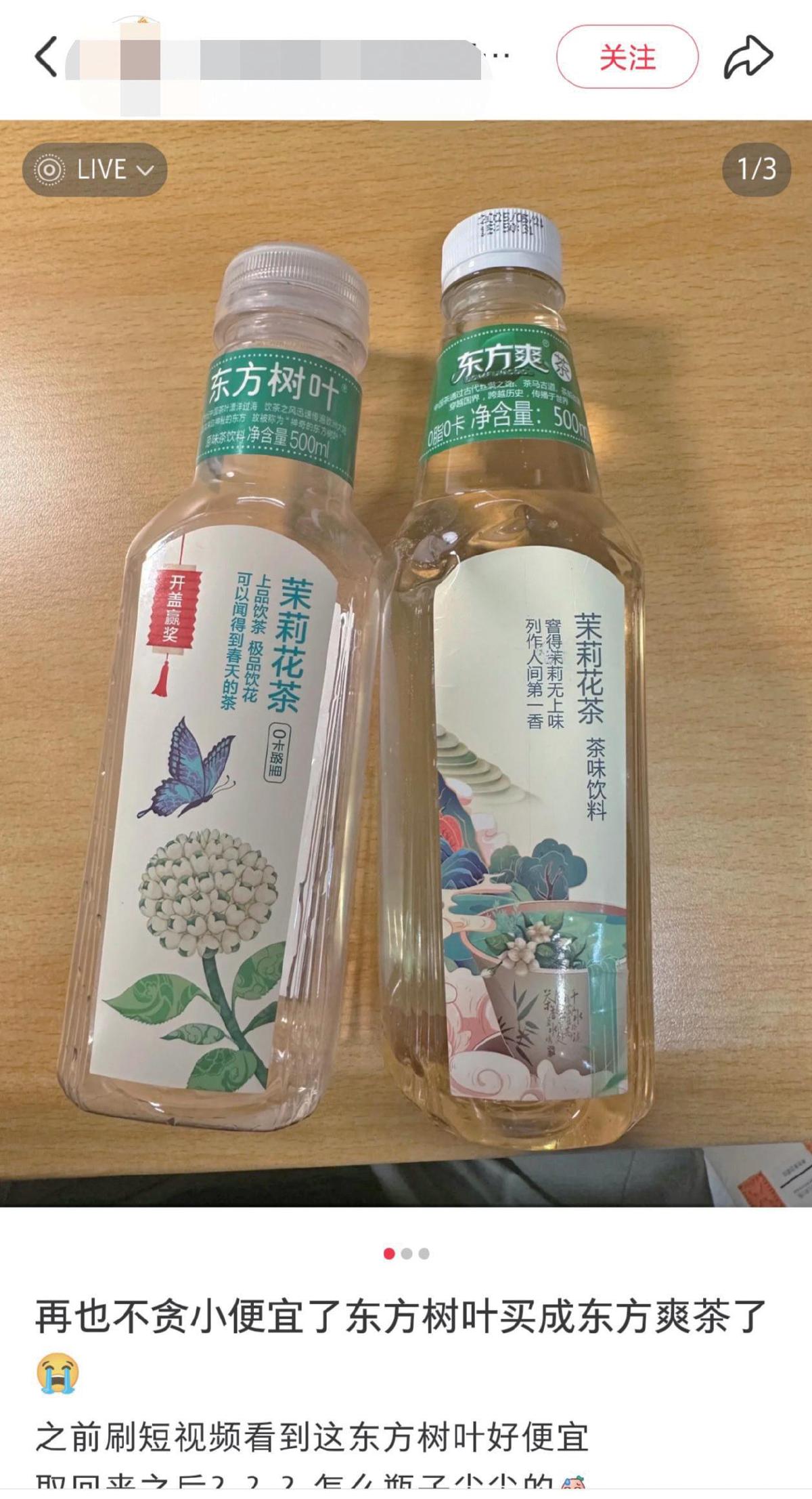 “在社交平台刷到这个产品时,我以为是东方树叶,价格还便宜,结果买来发现根本不是。”一位消费者在社交平台发文吐槽,称自己买到了与农夫山泉旗下无糖茶品牌东方树叶高度相似的“东方爽茶”。这位网友的经历并非个例,新京报记者在社交平台发现,有多位消费者表示曾购买过这款产品,且以为它就是“东方树叶”。